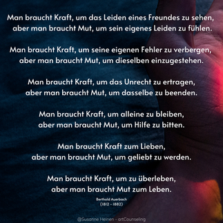 Die Einbindung von Worten und Texten von außen, erleichtern manchmal eine Öffnung nach innen. Die Arbeit mit "fremden" Texten schafft eine Art Schutzraum, da man nicht selbst in der Beurteilung steht, sondern auf ein Geschehen schaut und durch die Beschäftigung und Interpretation seinem eigenen Standpunkt näher kommt.