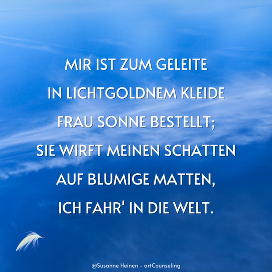 Im heutigen Montagsfunkeln geht es um Freiheit und um das Ausbrechen aus alten Denkweisen oder Schablonen, die von außen auf einen einwirken. Der Wunsch nach Veränderung ist oft da, aber man verharrt in seinem sicheren Käfig, hinterfragt manche Umstände vielleicht gar nicht. Ermutigen soll da das Gedicht "Ausfahrt" mit seinem kraftvollen Ausspruch "Ich fahr' in die Welt". Als Begleitung Frau Sonne im lichtgoldenen Kleid und dem Himmel als Zelt, da muss doch alles gutgehen, oder?