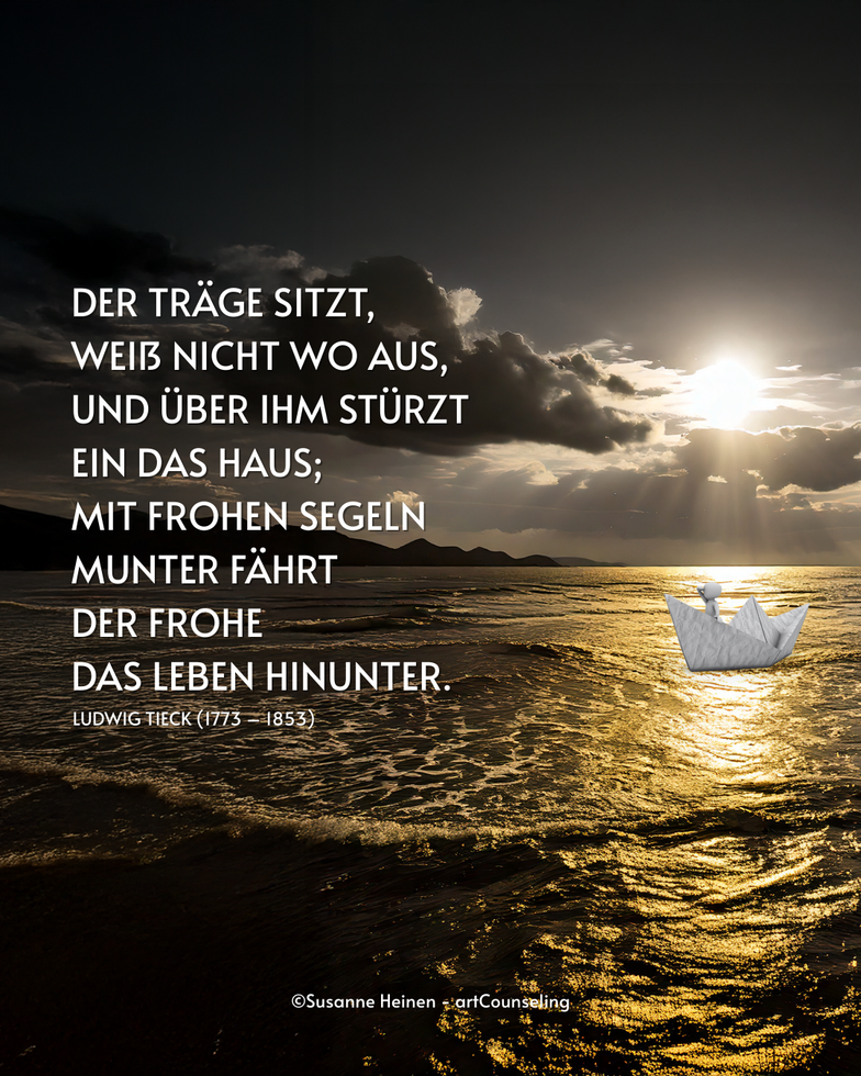 Einen Haken gibt es jedoch, und den beschreibt Seneca in dem Zitat sehr treffend: Wenn wir nicht wissen, wohin wir wollen, nützt selbst der stärkste Wind nichts. Die Zeilen von Ludwig Tieck wiederum beschreiben gegenüberstellend ganz plakativ das Gefühl, in Trägheit und Starre gefangen zu sein, und das unbeschwerte Dahingleiten auf dem Lebensfluss. Ein Gedanke, den man bei sich selbst einmal hinterfragen kann.